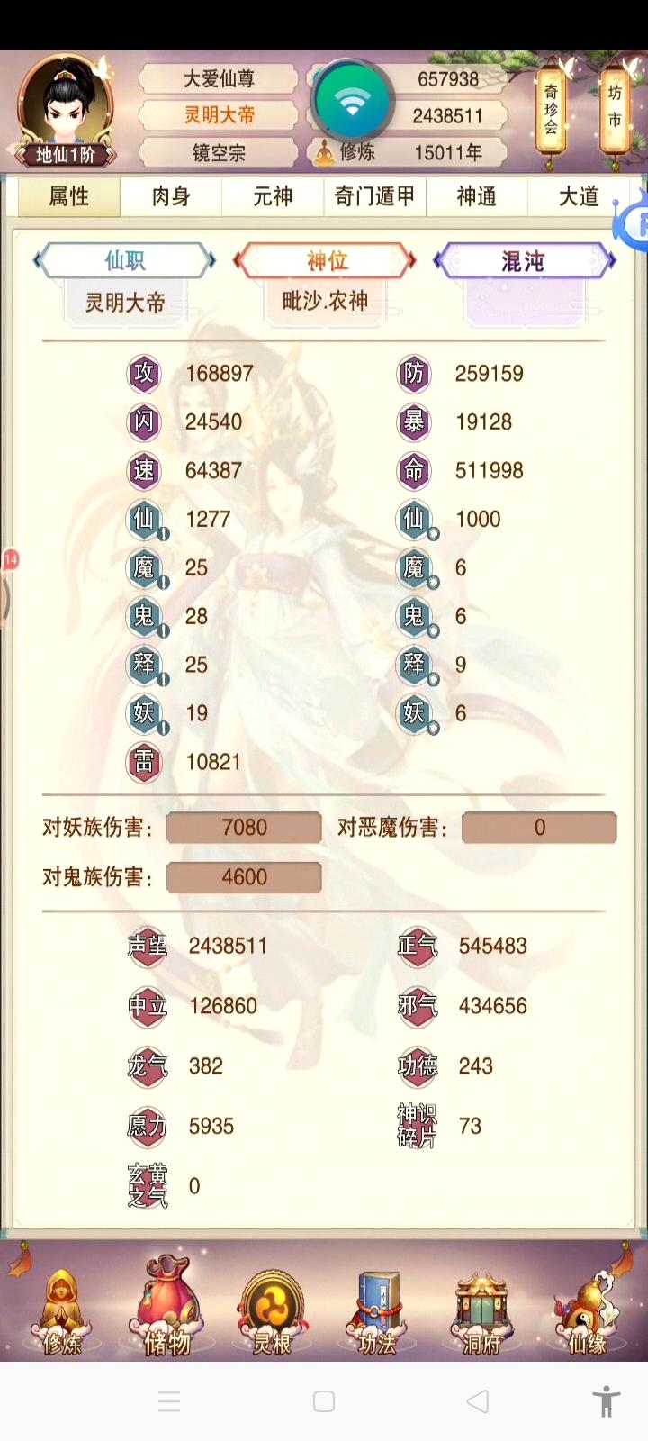 属性:攻168897,防259159,血511980,速度64387,闪24540,暴19128,仙攻防各1000多一点