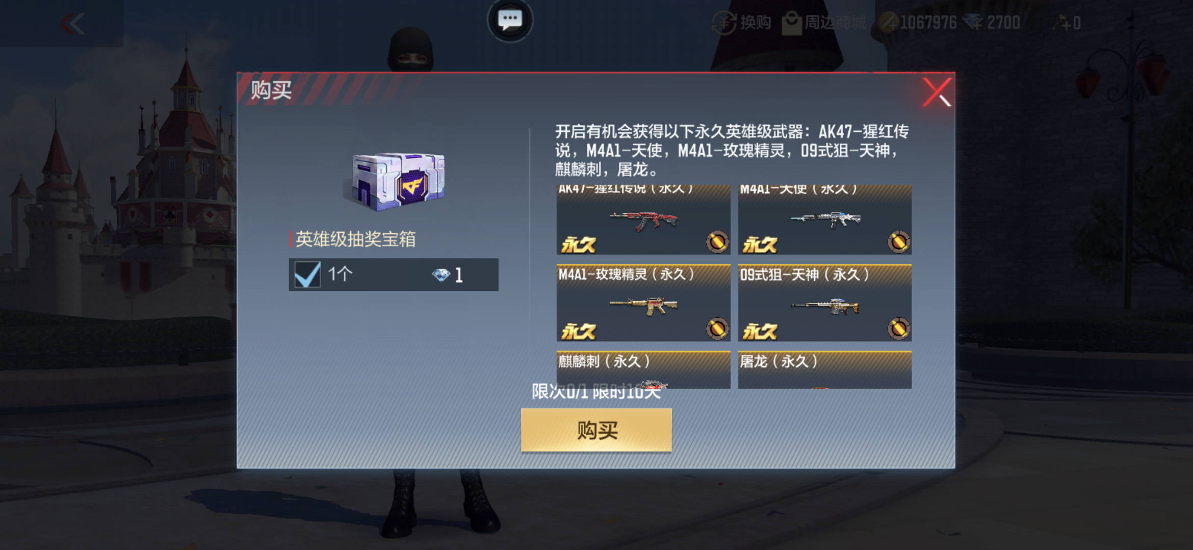 本次一钻购宝箱活动持续十天,每天限购一次。宝箱内含有机会获得的武器如下:AK47-猩红传说、m4a1-天使、m4a1-玫瑰精灵、09式狙-天神、麒麟刺和屠龙。不知道有没有各位同学想要的英雄级武器呢?