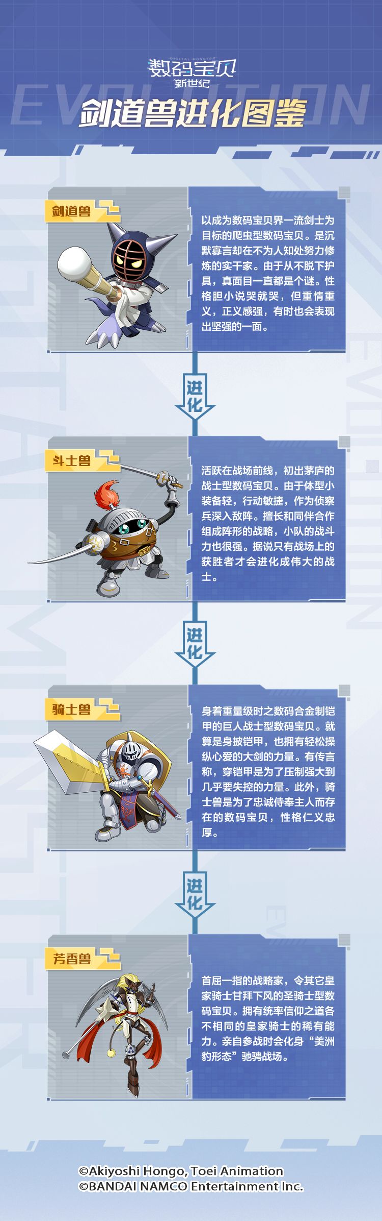 本期将介绍剑道兽其中一条究极进化路线:剑道兽→斗士兽→骑士兽→芳香兽,随着冒险进程不断向前推进,更多进化路线还待队长在游戏内体验哦~