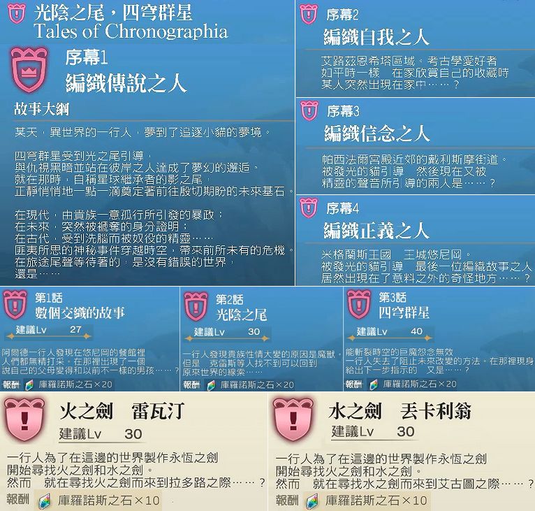 《光陰の尾、四天の星々〜Tales of Chronographia〜》,《光阴之尾,四穹群星 Tales of Chronographia》,TOC=Tales of Chronographia,Tales of即传说系列、传奇系列、时空幻境系列,Chronographia即编年史、年代记。所以此联动是时空猫和Tales of系列若干游戏的联动。