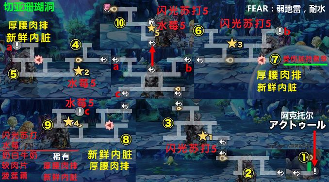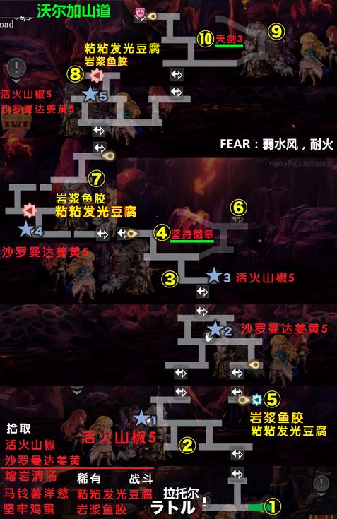 道中:1种弱水,1种弱水风,1种弱水打,都耐火。掉落5种料理素材