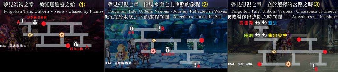 第3话:克鲁利大道→次元夹缝→火之村→支线《火之剑》(沃尔加山道)→水之都→支线《水之剑》(切亚珊瑚洞)→月影森林→克鲁利大道→时之楼阁→次元夹缝→协奏END→平行迷宫《梦见幻视之章》开放,详见第六部分