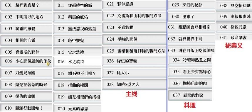 ②可在时之楼阁遗址地下石板大厅重复观看,共41个:1~28是主线,29~37是料理,38~41是秘奥义