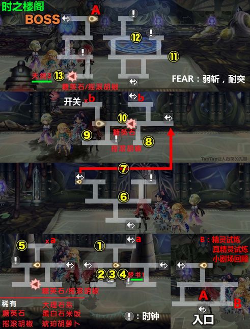 宝箱:①~⑬,其中④是梦书,⑬是天剑×3。梦书房间的门要同时踩点才能开,失败5次尤利会帮忙开门。