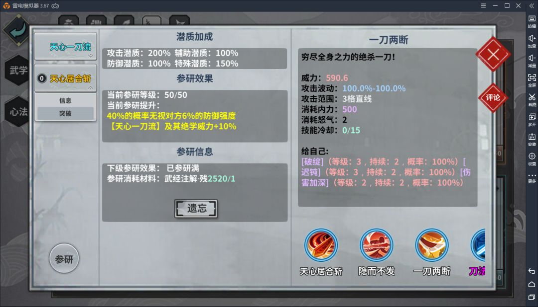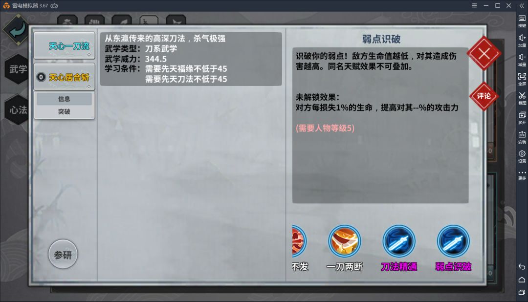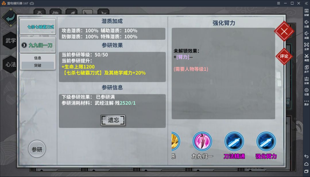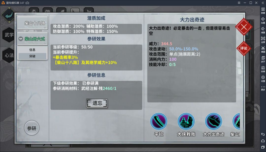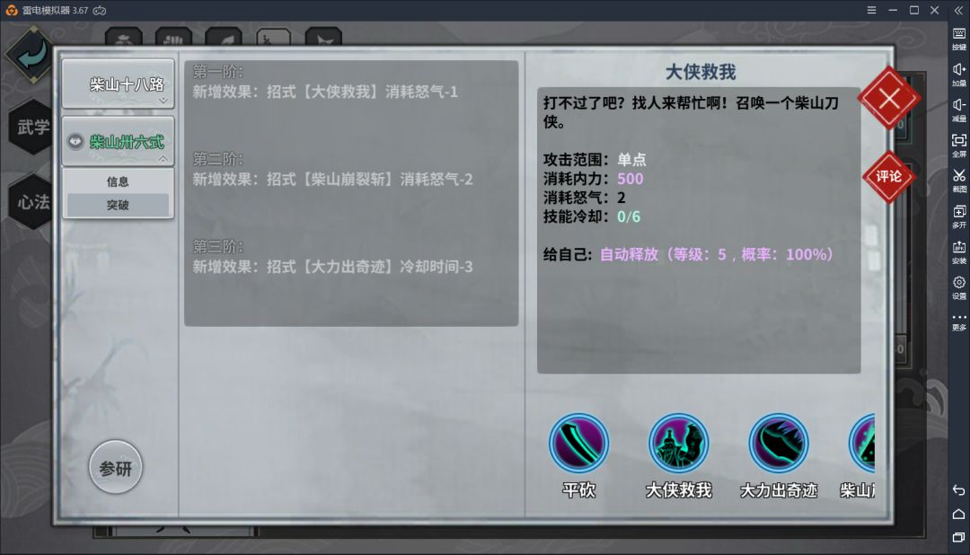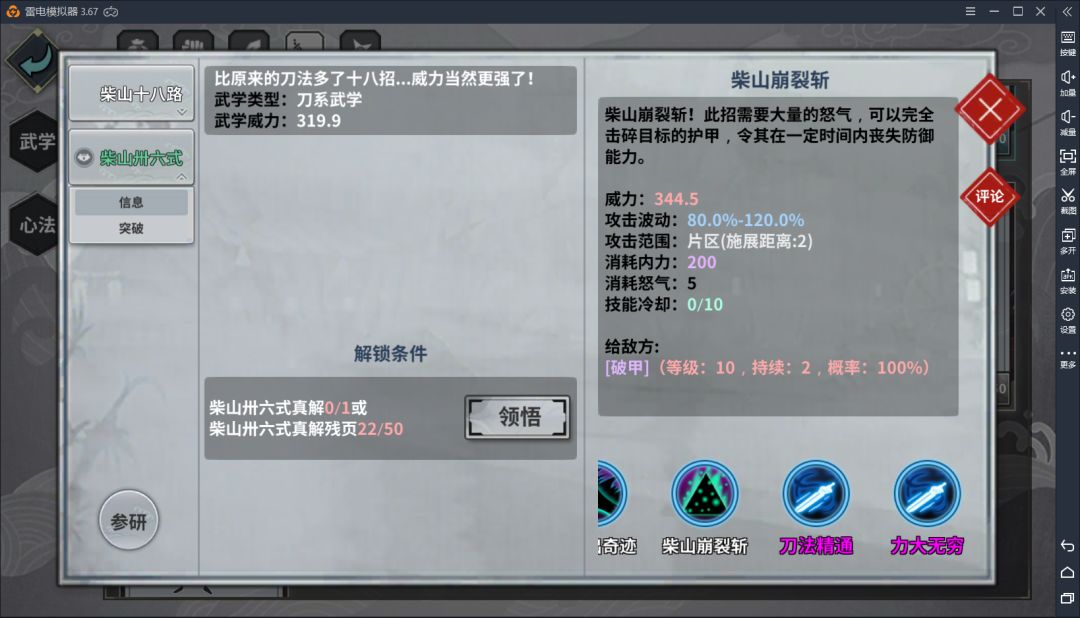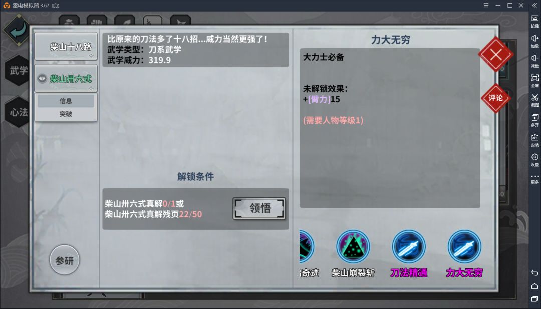 技能突破的话,说实话还不错,但是因为柴刀的底子太差,就算是突破很好柴刀也打不到后期,但是柴刀是一个很好的辅助加臂力的武学,自带力大无穷,这个和强化臂力是不冲突的,也就说你可以通过辅外功得到25臂力的增益。