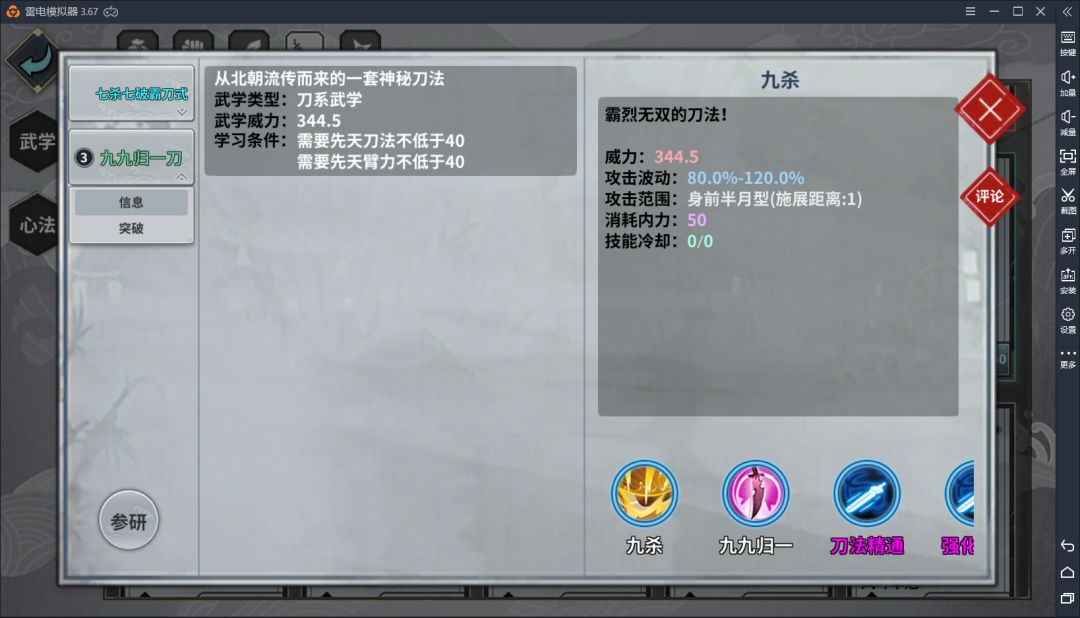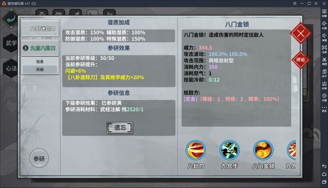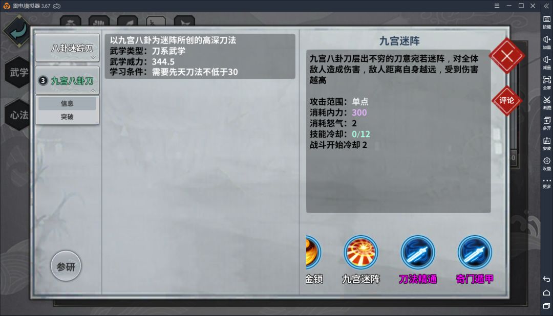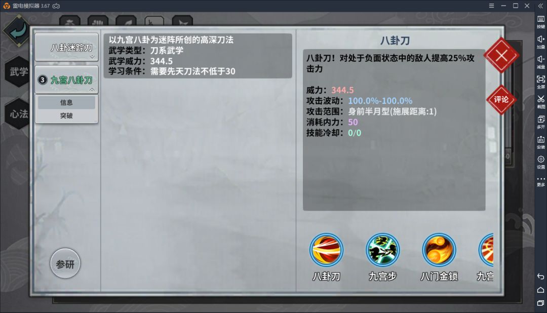 九宫八卦刀,威力344.5,简称八卦刀、闪避刀,倒二档武学,一个被低估的武学。武学来源商家堡(?)
