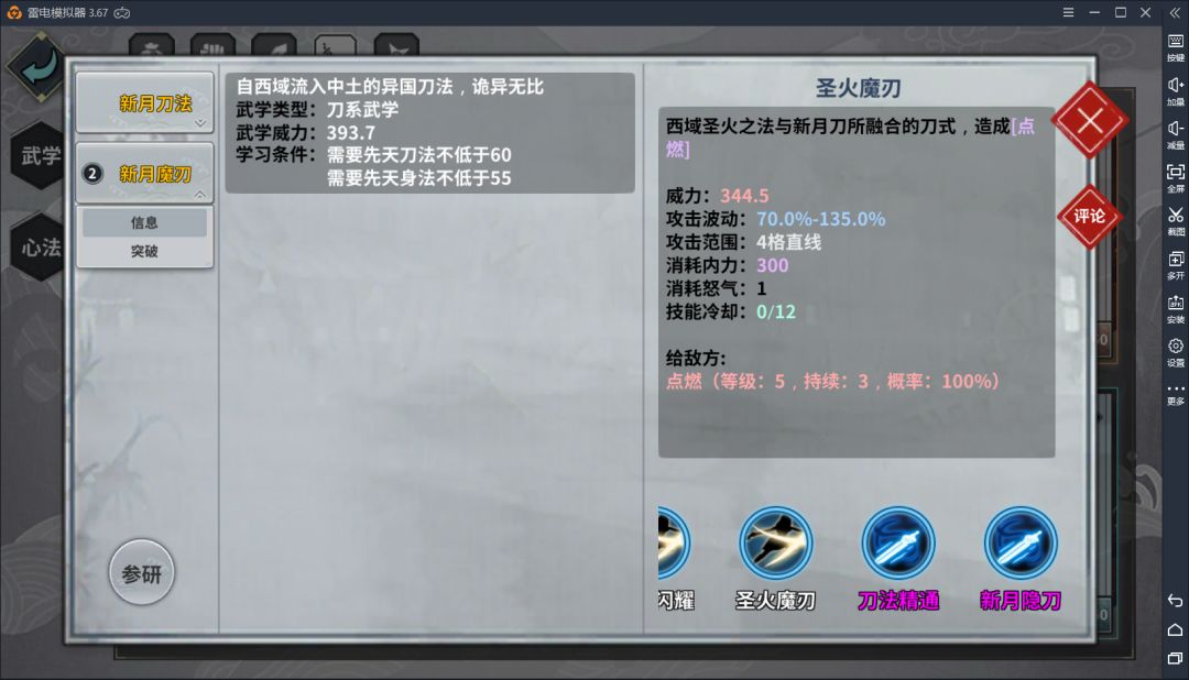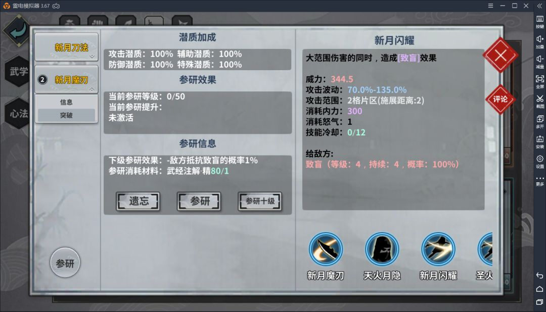 新月魔刀,新月刀法的进阶,俗称盲刀,威力393.7,一档武学,刀系输出武学——来自西域的刺客