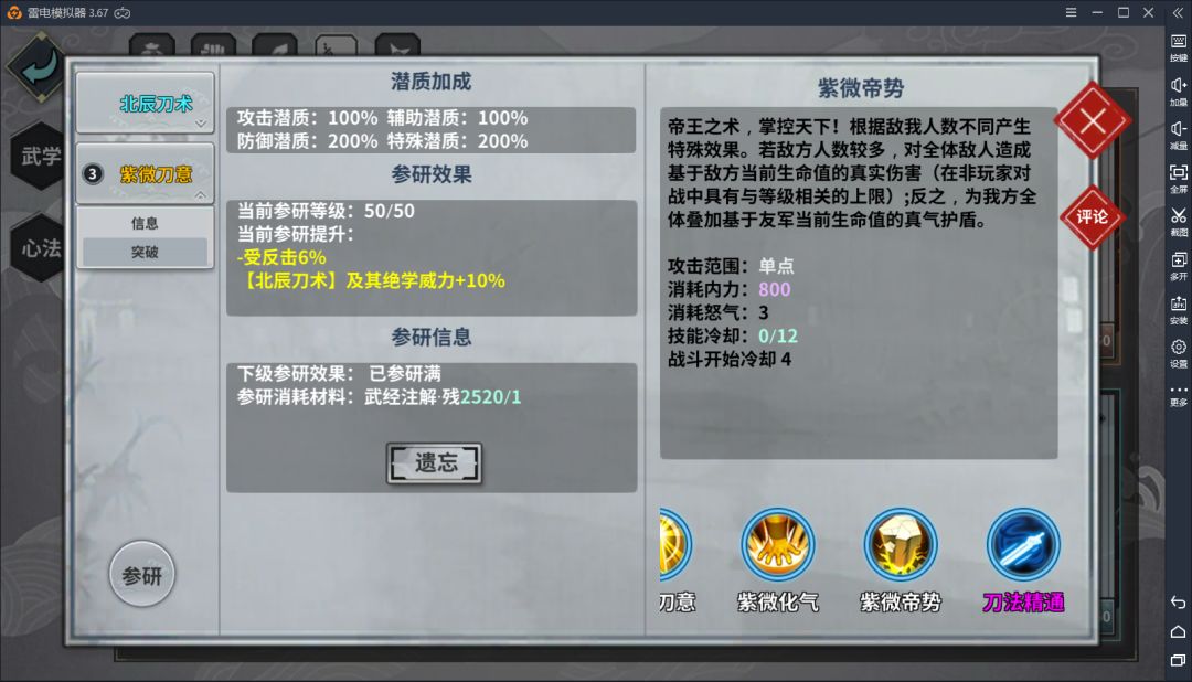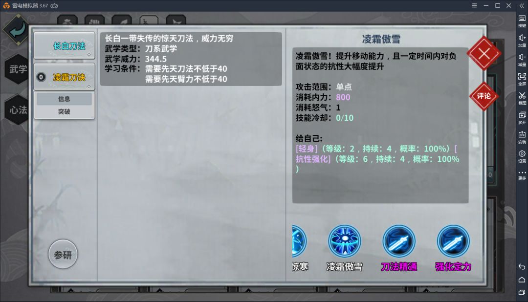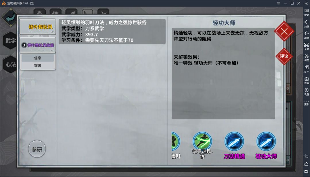 自带天赋轻功大师,这个是和红色心决青蝠有相同的功效可以无视人物阻挡,让自己在战场上穿梭自如,特别是刀系鎏芒刀还自带+1的移动。