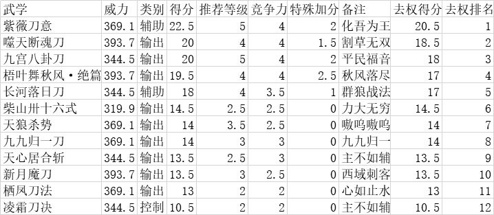 刀系排名前三甲特别的有趣,首先紫微刀完全是版本红利,若非奇遇对它的加持评分不会如此之高,其次如果说紫微刀是奇遇加持,那么连斩刀就是割草加持了,特别是在帮会粮草战的时候,连斩刀和慈悲掌是打分必备,第三的八卦刀就只能说是资源红利了,23333,八卦刀完全是因为它极低的资源需求,在去资源化的角度,它的评分绝对会往下降。如果说八卦刀是得了资源的利,那秋风刀就是吃了资源的亏,秋风刀不弱,但是也没达到极强的地位,在这种情况下资源上面就会大大地扯后腿了,这一点从前面剑系的太极剑也能看出来。