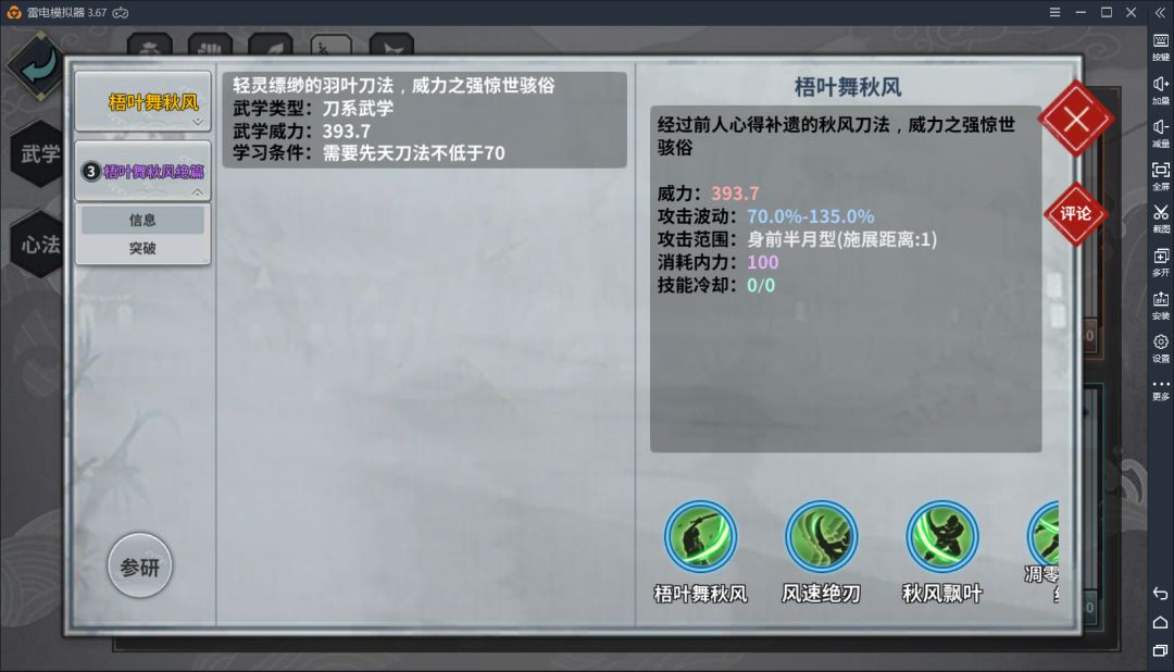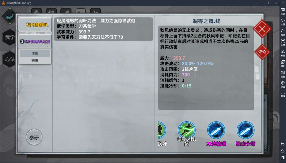 梧叶舞秋风·绝篇,梧叶舞秋风的进阶(这名字我严重怀疑策划是不是偷懒了),俗称秋风刀,威力393.7,刀系唯一通用绝武——其实没你想象得这么强