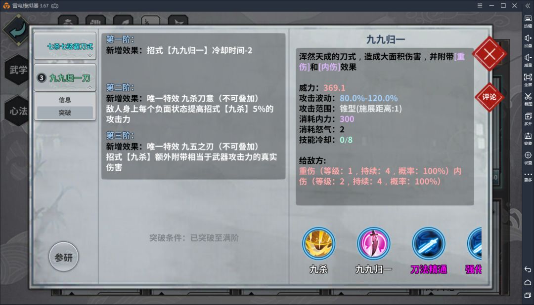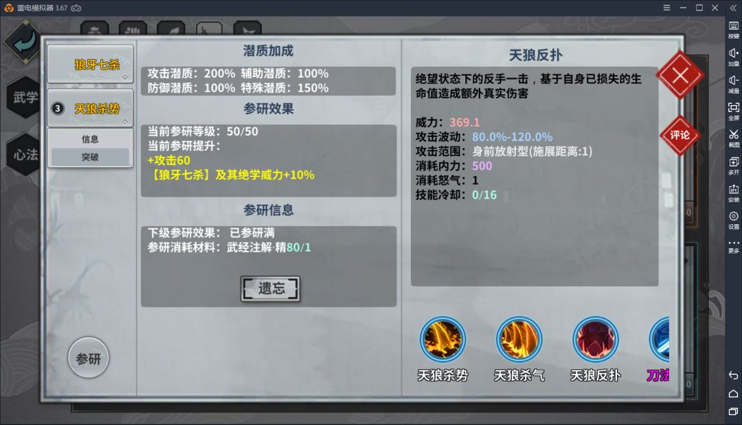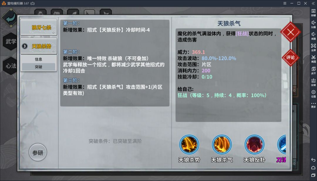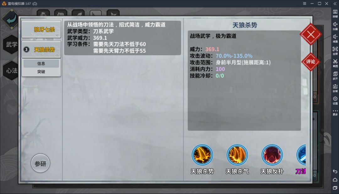 天狼杀势,狼牙七杀的进阶,威力369.1,倒二档武学,刀系输出武学