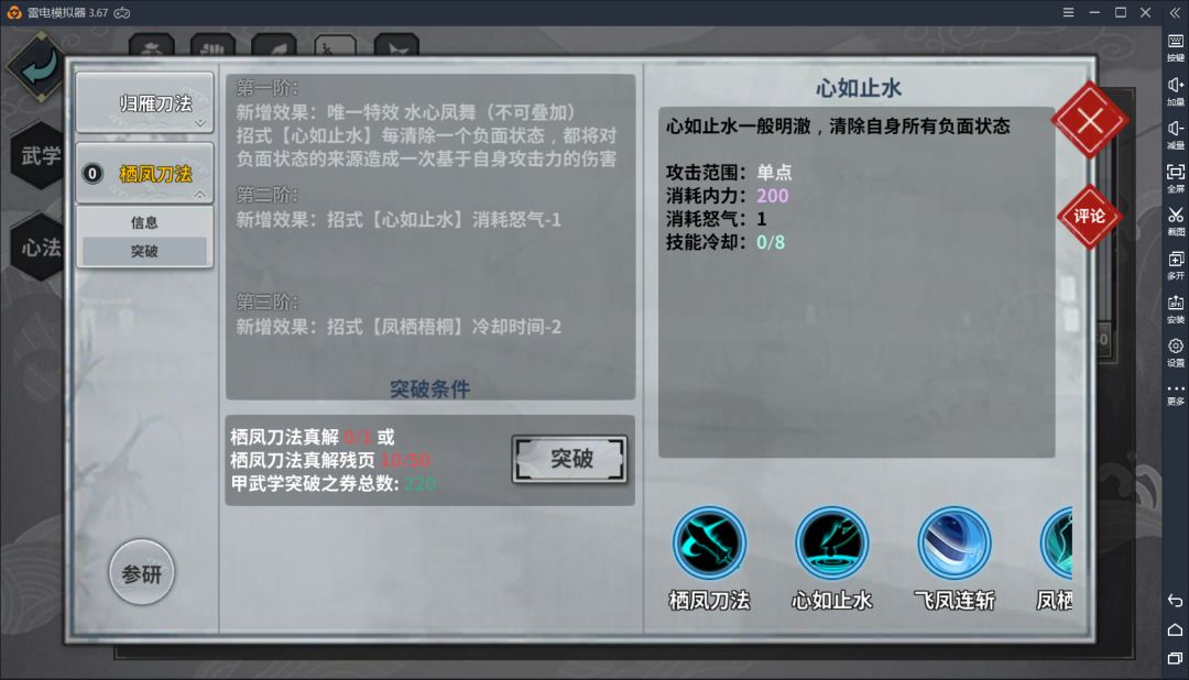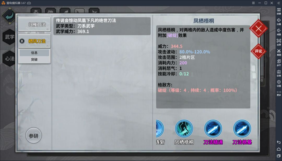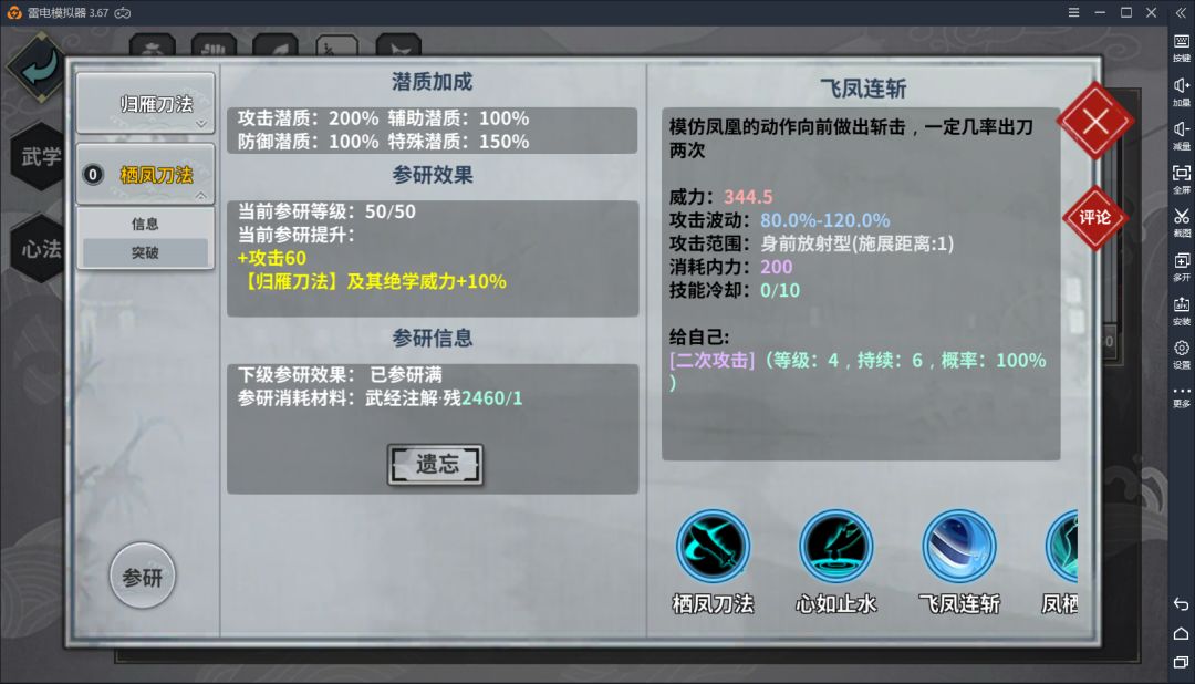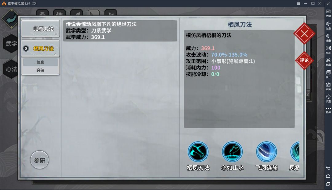 栖凤刀法,归雁刀法的进阶,威力369.1,属于第三档威力,比较冷门的武学