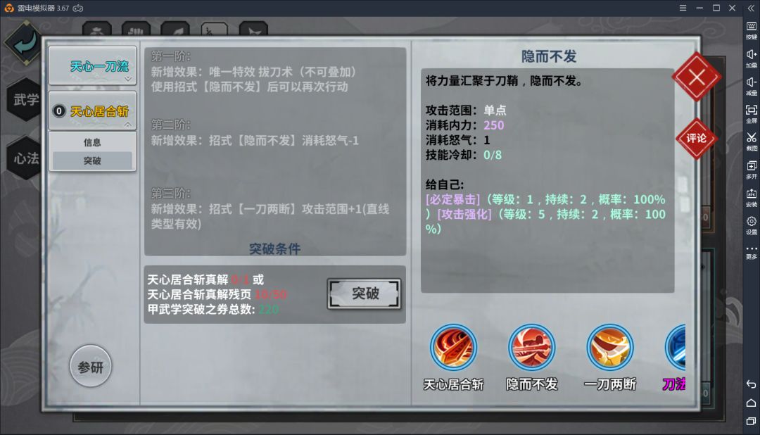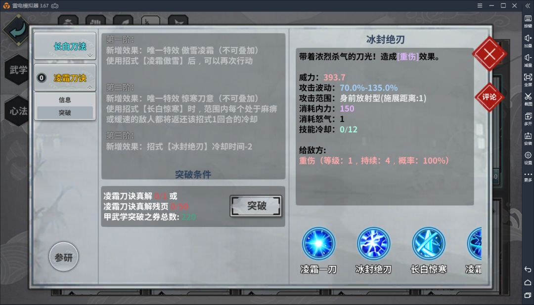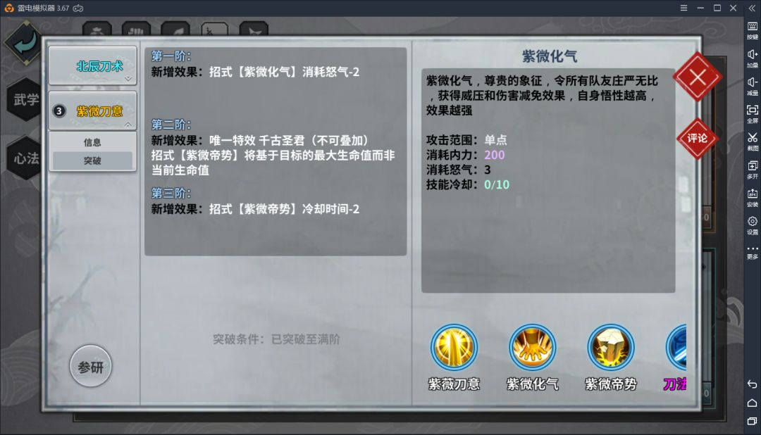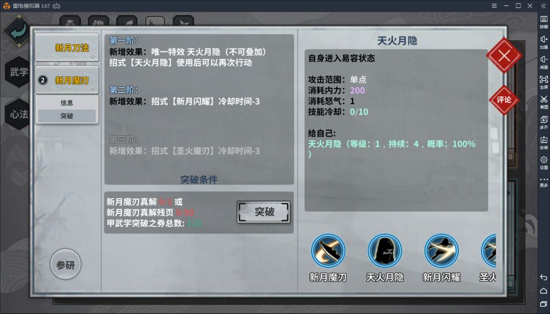 武学除了先天紫级(就是墨子悲丝和圆明寂照)外,外功可以通过祈福获得真解然后突破,零级突破只是活动新的武学,之后可以进行三次突破,每次突破都可以获得新的增益,和三次人物突破合称三突三破。