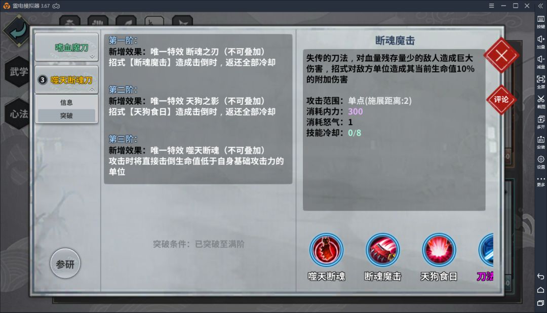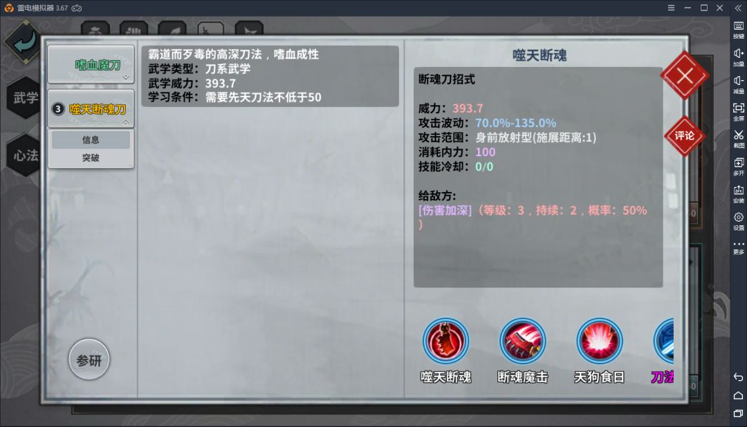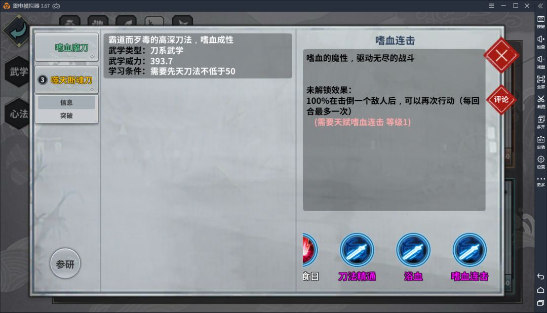 噬天断魂刀,嗜血魔刀的进阶,俗称嗜血刀、连斩刀、斩杀刀,威力393.7,正二档武学——割草无双