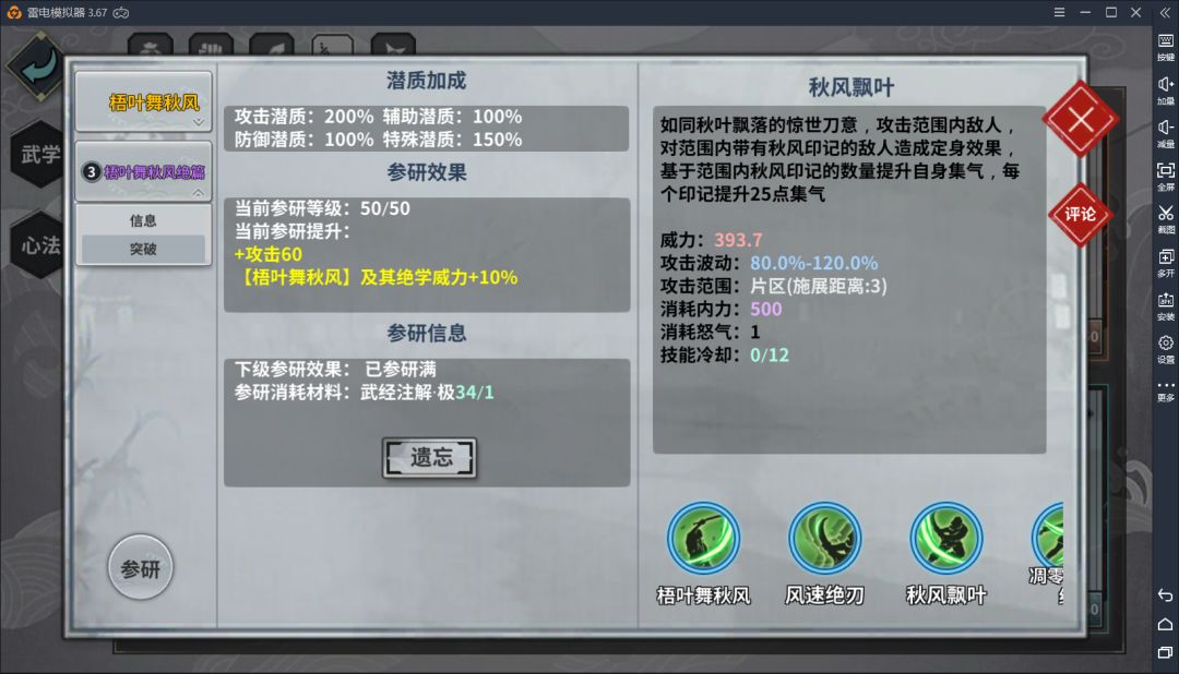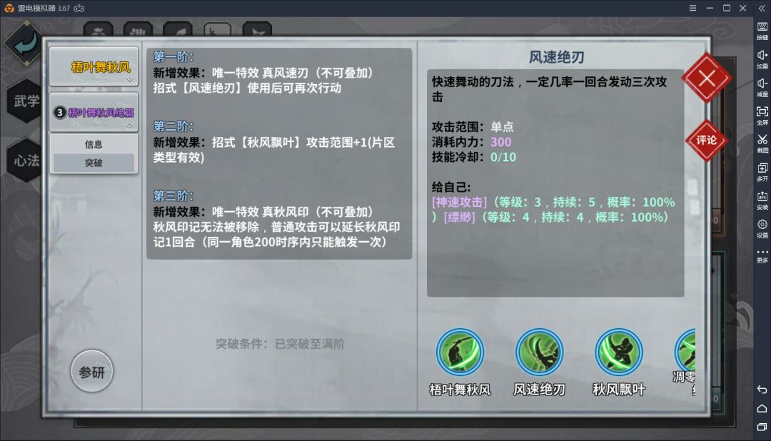调整:武学【梧叶舞秋风绝篇】二技能【风速绝刃】给自身叠加4级【缥缈】持续4回合,怒气消耗由1=>0