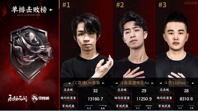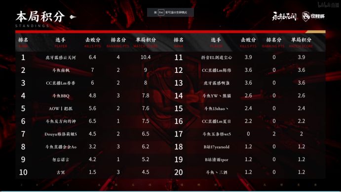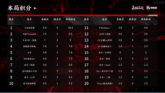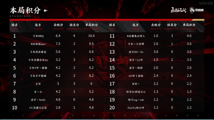 本局积分前三名由获得战神称号的“斗鱼BBQ”荣登榜首,“B站清雨tpor”屈居亚军,“斗鱼折此桃花”排名第三。