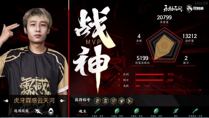 本局比赛由“虎牙霖感云天河”荣获战神殊荣,赛后采访中“虎牙霖感云天河”表示:“特木尔是最喜欢的角色,阔刀简单好用,稳扎稳打就是胜利。”