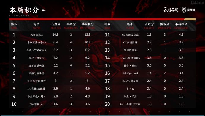 本局积分前三名由获得战神称号的“虎牙灵羲xi”荣登榜首,“斗鱼直播余余Ao”屈居亚军,“斗鱼丶YOOZ柚子”排名第三。