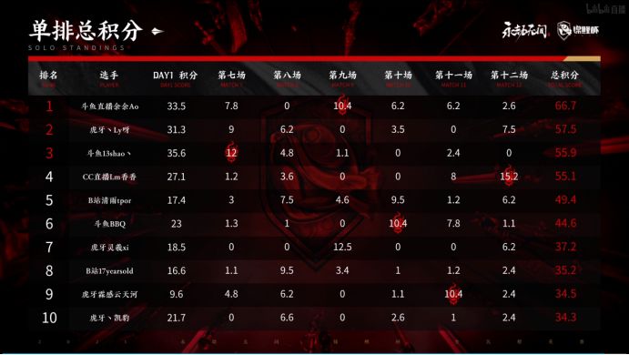 永劫无间“锦鲤杯”总决赛单人排位第二日比赛积分榜: