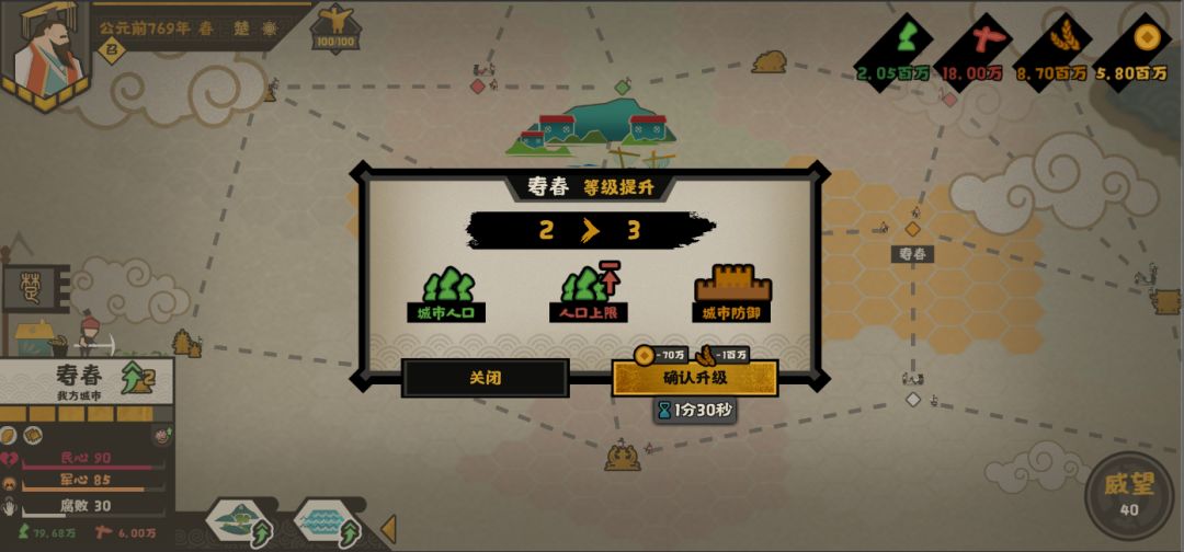 当城市的人口到达一定程度后,就对城市进行升级,升级后的城市会获得更多的资源点,更强的防御,更高的人口上限,以及更多的人口。