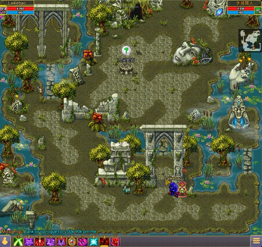 如果在小沼泽死掉人物会直接回到大沼泽起点,很多新手都在这里被却劝退,建议准备一组复活卷轴和血药,穿好装备,在小沼泽磕磕碰碰传到下面这张图然后找到绿色问号就OK了