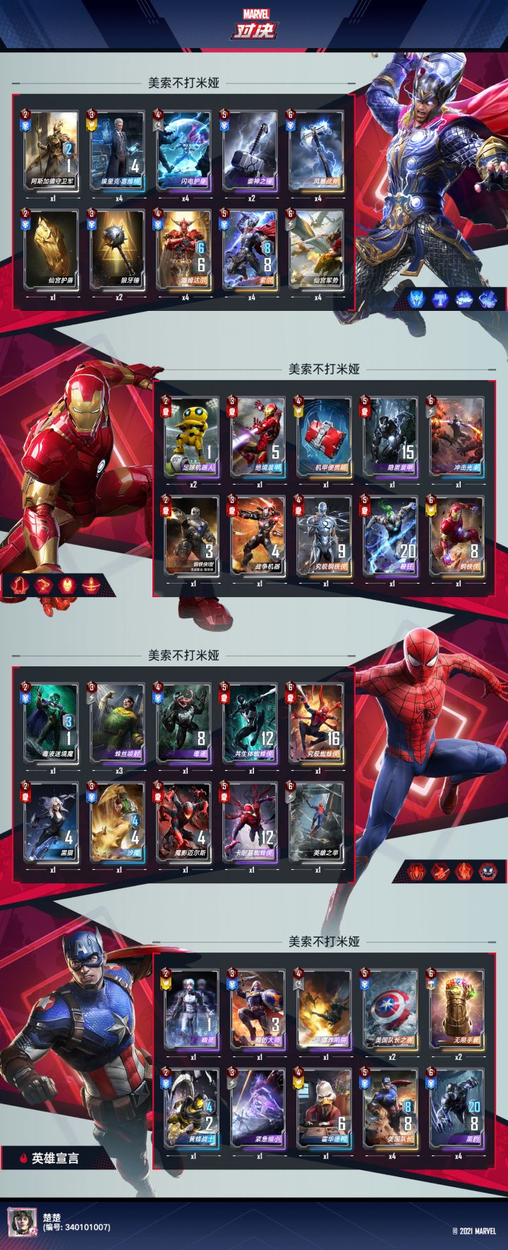 缺点就是对卡量要求高,两张索尔和两张美队不是不能玩,但吃鸡很多情况就是需要满配的,还有就是对个别无线资源流像麻辣鸡丝洛基等需要蛛丝或者手套等针对一下。此外卡位比较死板,带不了蚁人等,对付洛基时有些麻烦。