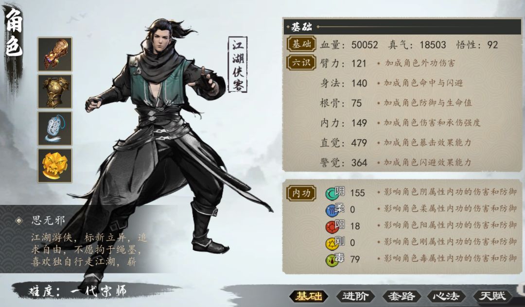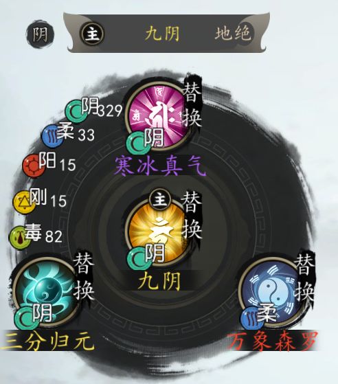 心法:主九阴(九阴真,贯通效果最佳),辅寒冰真气(九阴真,寒气,怡神),八荒(反制),金阳(静功)。因伤害过高,演示不了2次反击,金阳和八荒都只升了1级。九阴真从面板看增加了50%威力。