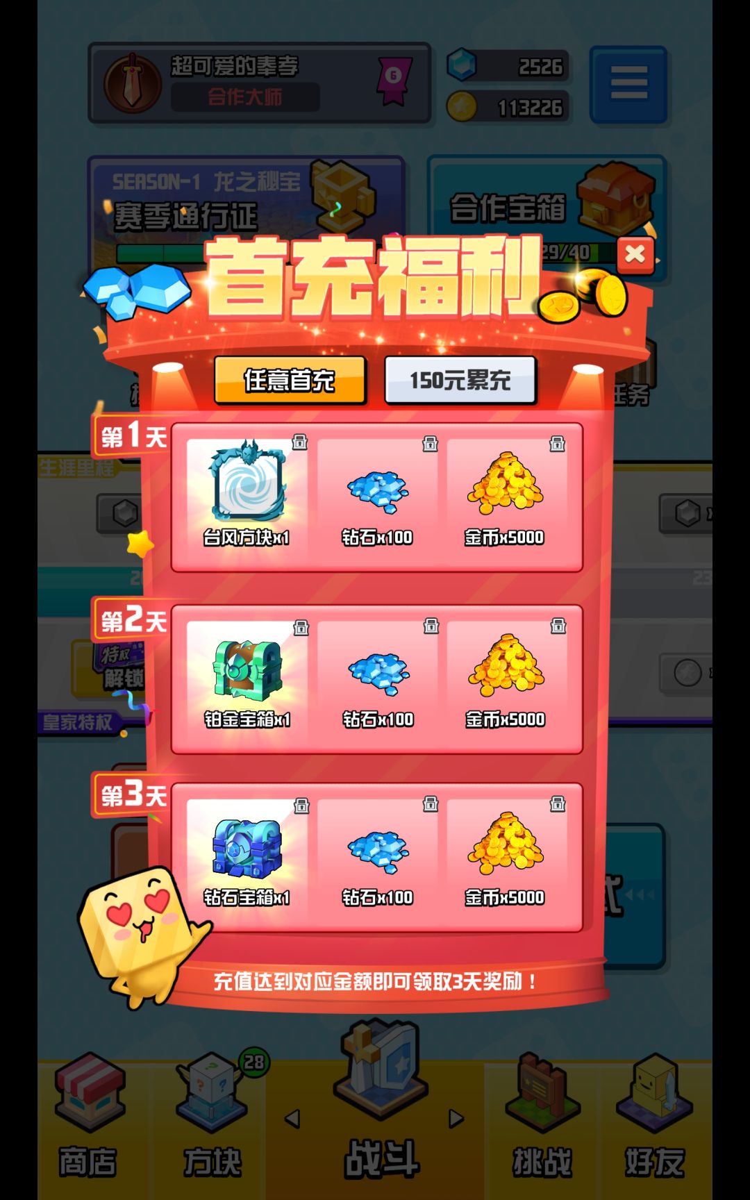 ①每天上线找个大佬带过合作40关把门票刷满(看广告和钻石买)然后兑换商店直接合作宝箱拉满。