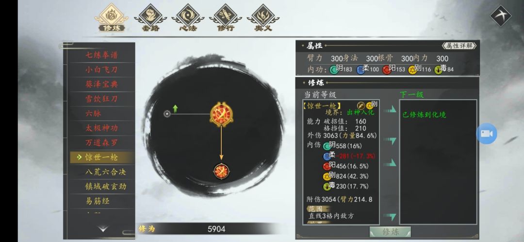 如图所示。《惊世一枪》中,因为是刚系招式,所以内伤值中展示的非常清楚。刚属性加成内伤最多,柔属性是减成内伤。
