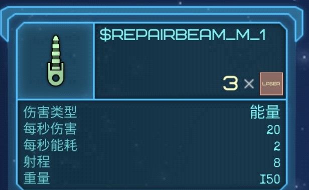 相比玩家的小型修复激光,此武器为反而像完整版,更高伤害,更远的射程,能耗还与小型的持平