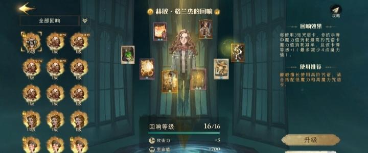 一、回响选择 首先回响方面选择用赫敏,在现阶段双人排位大环境下大多数决斗者用的都是贝拉赫敏哈利,赫敏回响的效果笔者在这里不过多赘述,在组卡思路上,卡组需要利用低费咒语快速触发回响效果,从而使玩家手中高费咒语卡费用减半,可以短时间打出一套高额伤害的“组合拳”。