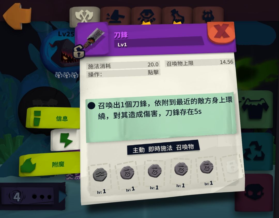 「刀锋」,刀锋小技巧,只要一把刀命中敌人且身上还有刀锋的情况下,就算你跑离开了画面,召唤的刀锋,依然会飞过去联合斩杀。(搭配新召喚按鈕功能)