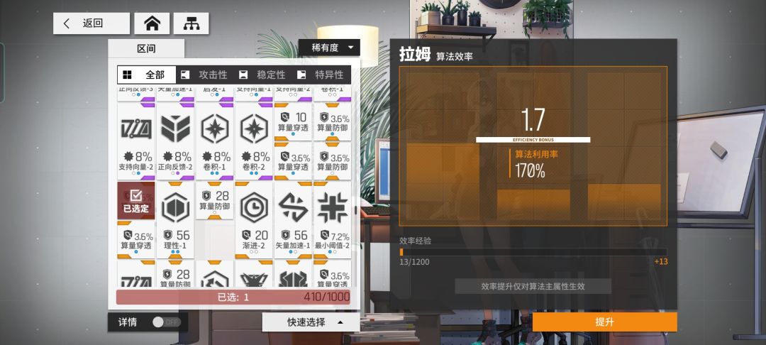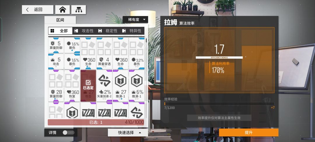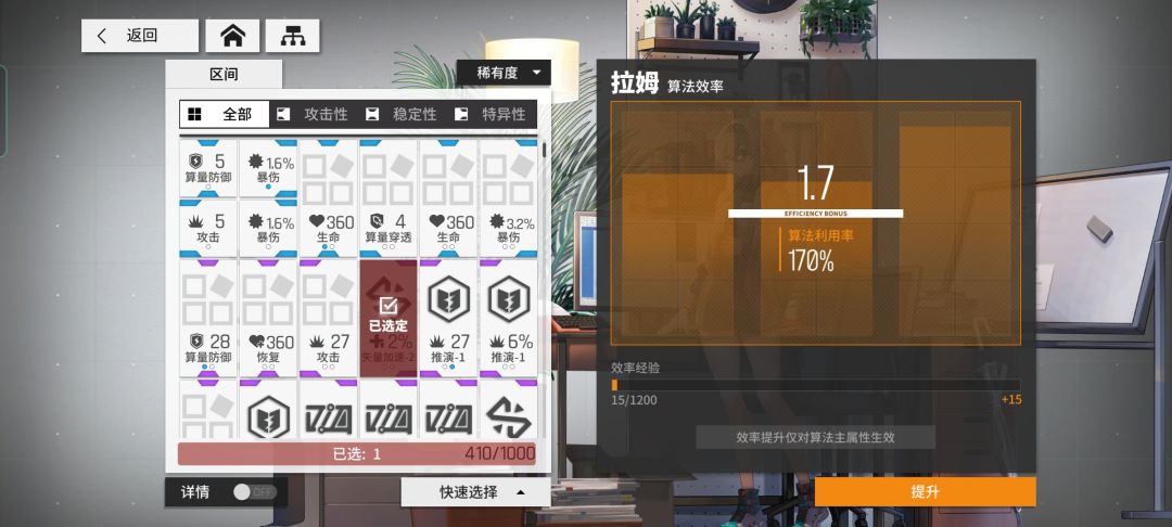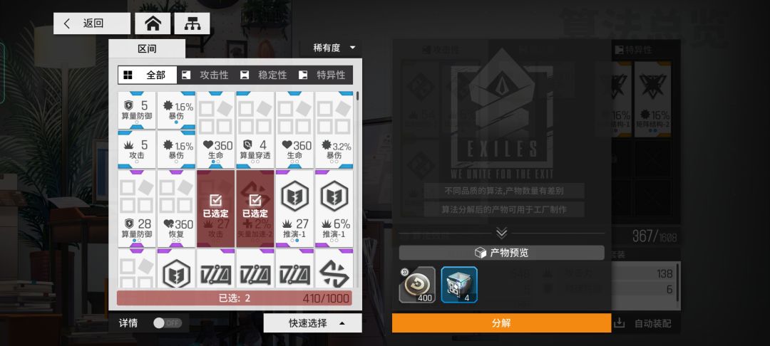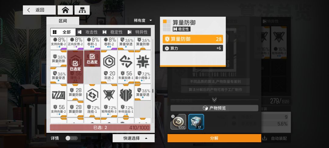 橙色算法目前我们不是特别富裕,一般不推荐拿去分解或当狗粮,通常情况下是留着重构或者给以后的角色用,但如果要分解,推荐分解短条算法,一个短条算法分解得500底格币+7算法碎片,作为狗粮经验13,一个长条算法分解得500底格币+10算法碎片,作为狗粮经验80。话说回来,橙色算法可以分解,但最好只分解没用的短条算法,因为短条算法不能重构,主词条和副词条明显没用的可以拿去分解,长条算法一般留着重构就好。