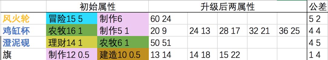 再看之前的风火轮和澄泥砚,风火轮的公差是5和2;澄泥砚公差是4和5,每级农牧增加的数值反而高于理财。