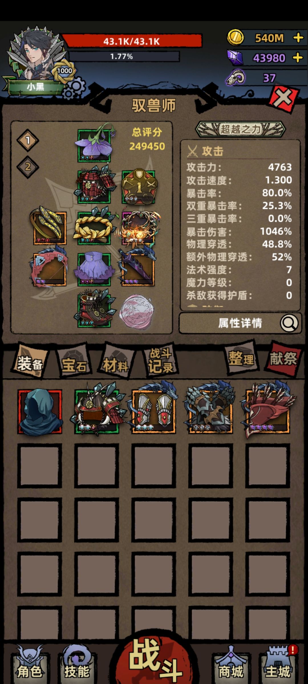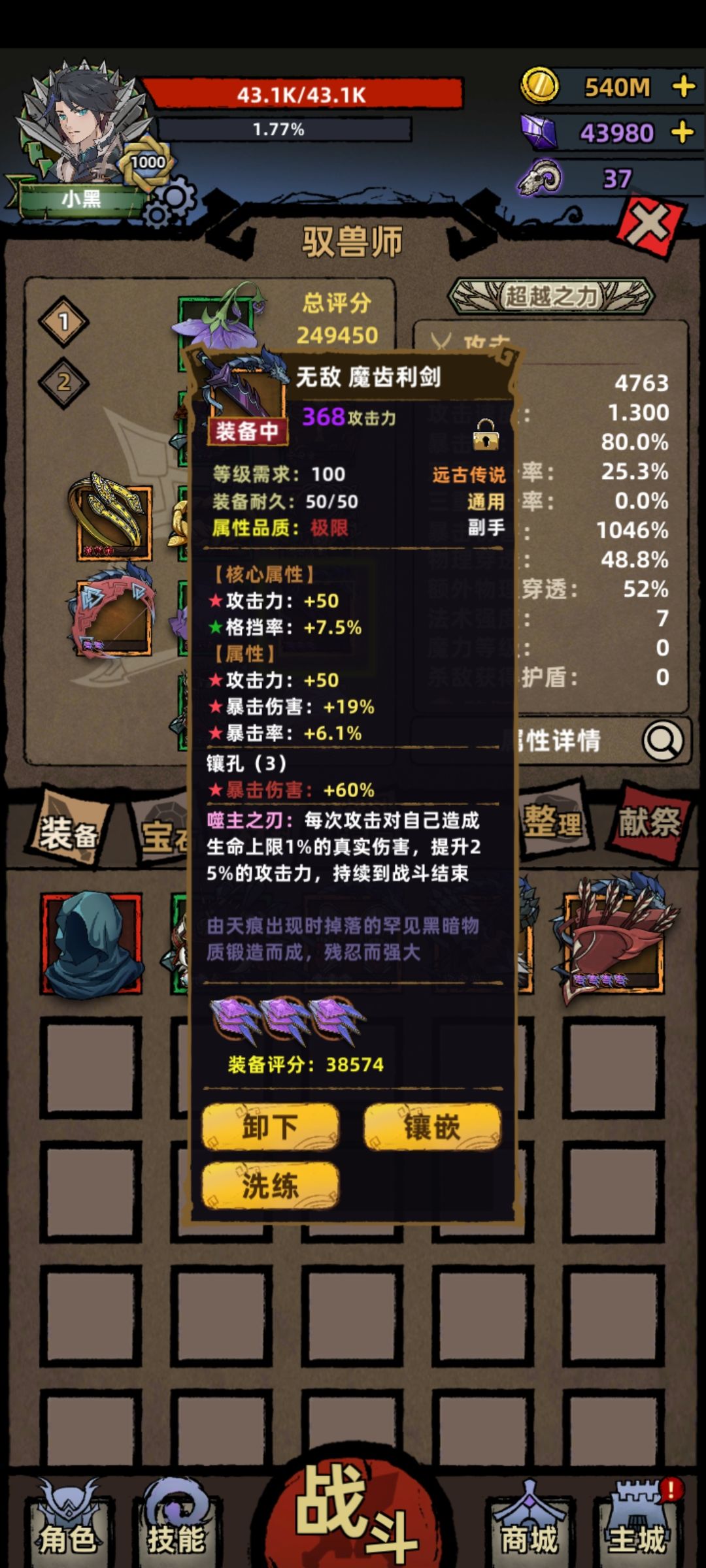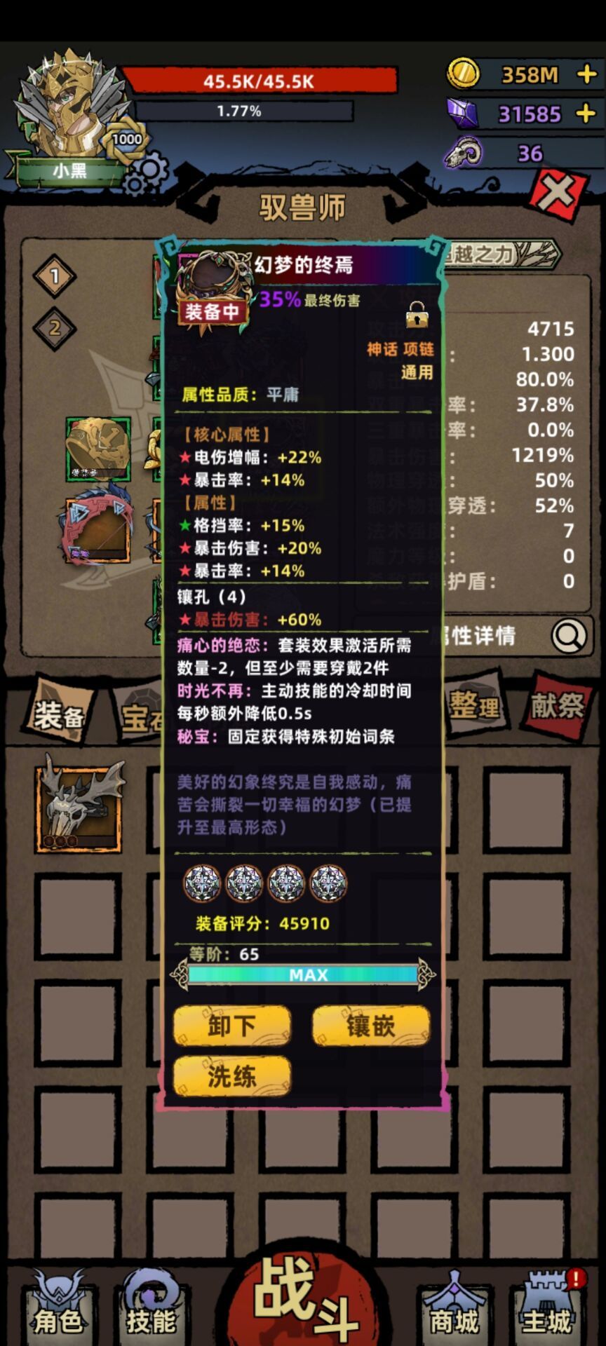 这次更新驭兽直接起飞了。直接挂机到3700,然后手动到了4000。3000层以上都是10s内过图,效率太高了。下面是最新装备搭配