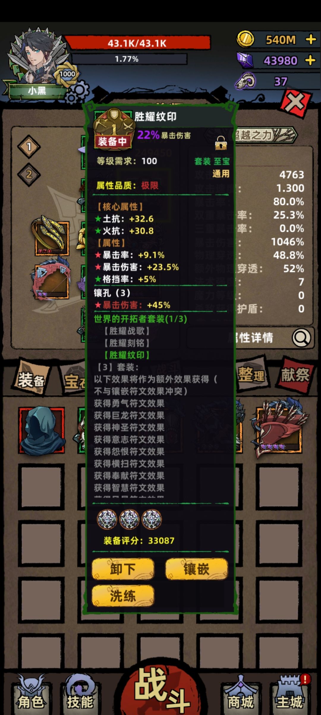 下面是技能,最开始用的狼鹰猪,攻速快。高层才发现,这是暴毙的关键。因为三爆触发是攻击次数,经常被卡死,所以我换了猪和熊王,猪的减伤和aoe,熊王的五倍伤害和加攻,都是特别好用的,也配合装备。