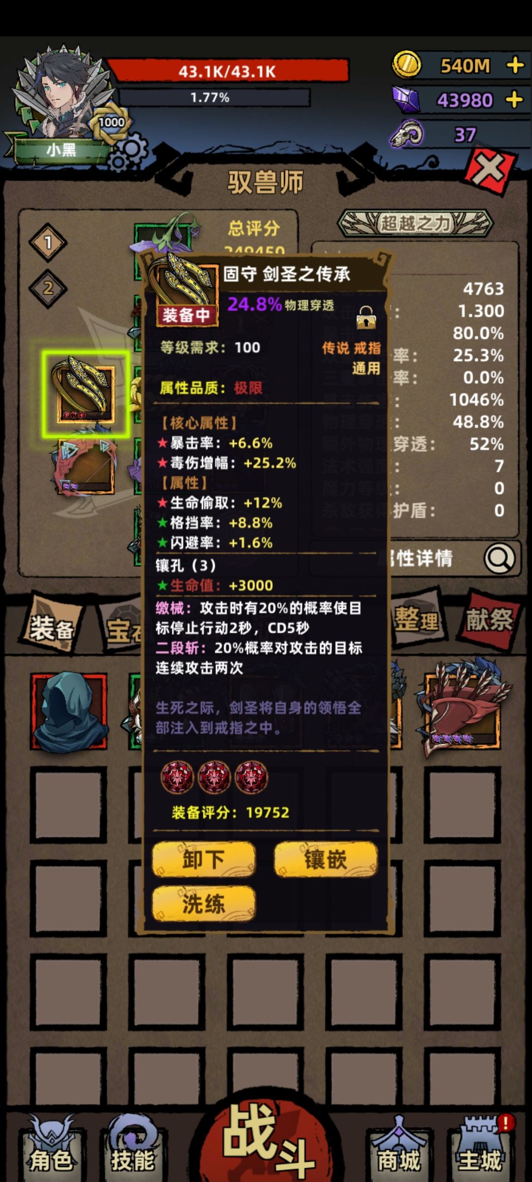 剑圣爬高必备,抗性戒指没卵用,“极大”就100抗性而已,完全没有剑圣好用,缴械高层神技,保命的,被动用二连击,配合触发不死。