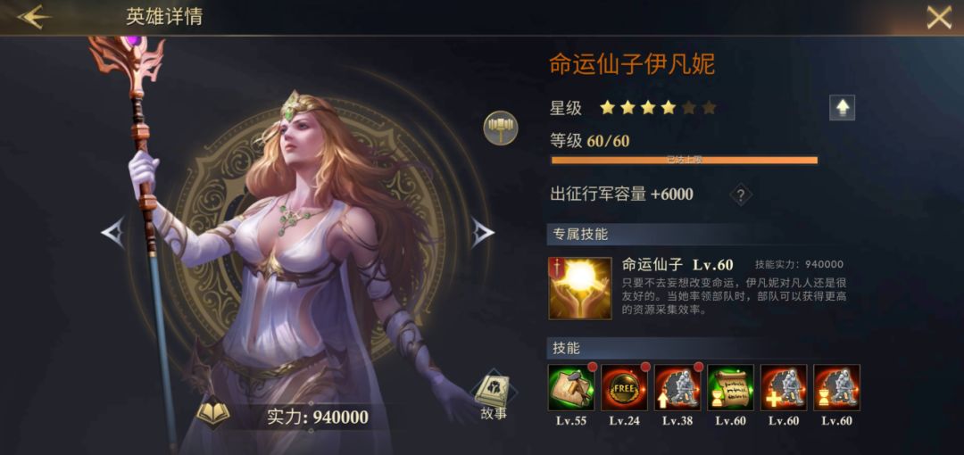 基础效果:伊凡妮出征时,所有资源采集速度+40%(后续加成均按满值写)