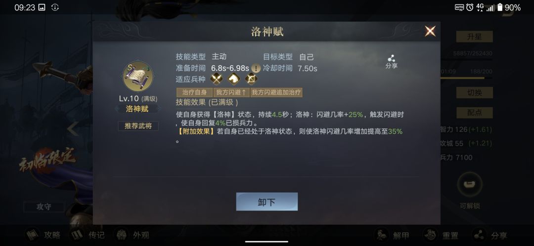 不过就武将的技能+20%闪避,和15%减命中,也还是不够高,所以我们堆闪避,以及减敌人命中,相辅相成,才能把闪避率做到最大化