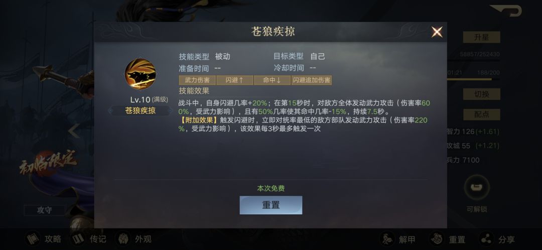 最后还有一个附加效果,触发闪避时,能对统率最低的敌方武将发动武力攻击,伤害率220%,此效果在触发闪避后能增加输出,所以我们只需要能增加闪避