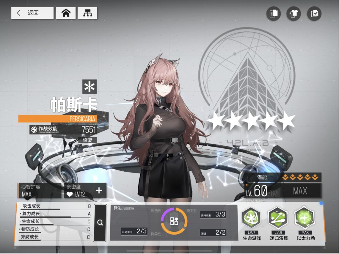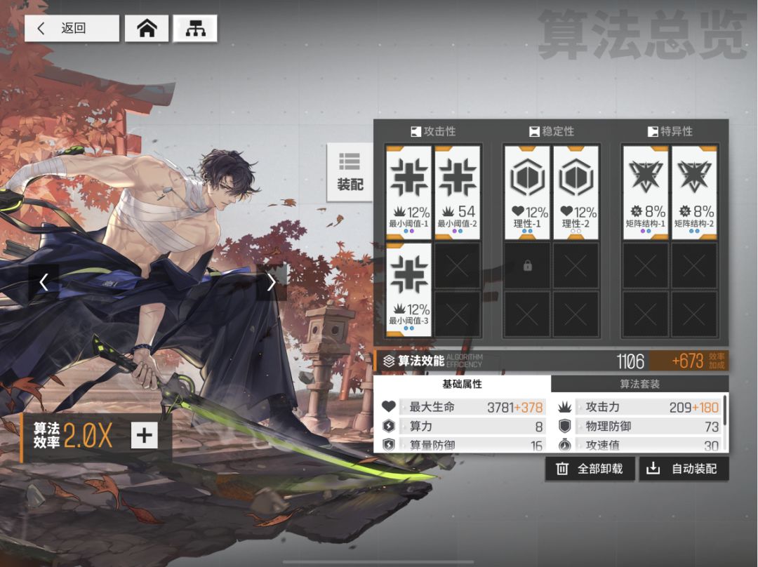 算法没什么好推荐的,实际上这个东西的提升并不算大,在前期把算法的主属性凑齐比具体的算法套装提升还大一些(刚入游的前期我会这样推荐,前期投入资源刷太多算法本实际上提升是非常小的,因为很容易刷一天没一个用得上的)