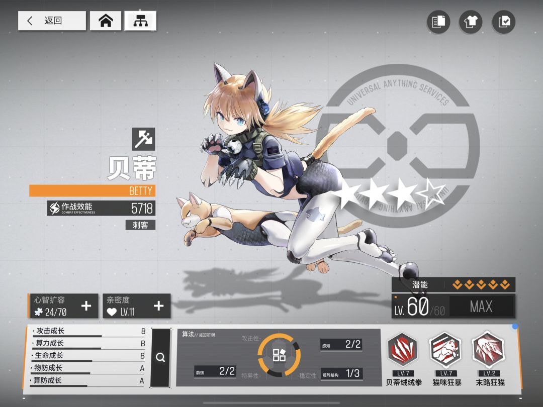 贝蒂最大的缺陷在于其初始是二星角色,因此想升级上去会吃更多的资源,提升也会更困难(仅限于前期,后期每天会有5个晶片商店的产出提供,实际上养成并不会困难太多,主要是一开始想升到三星需要比较大的付出
