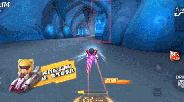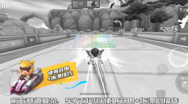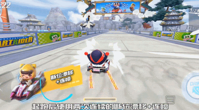 所以在起跑后,可以使用两次连续的断位漂移,同时配合使用连喷,在到达第一个弯道前,集满第一个氮气。存下的氮气将在后面复杂赛道使用,争取宝贵的时间。