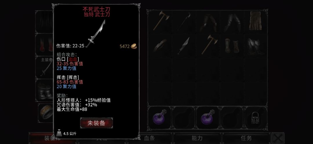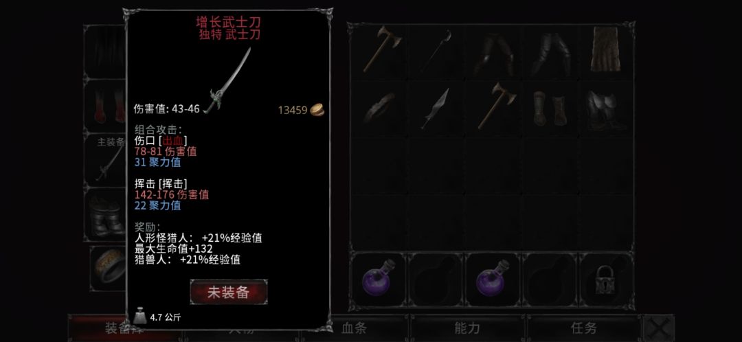 放血刀(以及匕首)的最低伤害和最高伤害是一样的(这里是加点导致最高伤害增加),并且这个伤害与同级别其他武器相差甚远