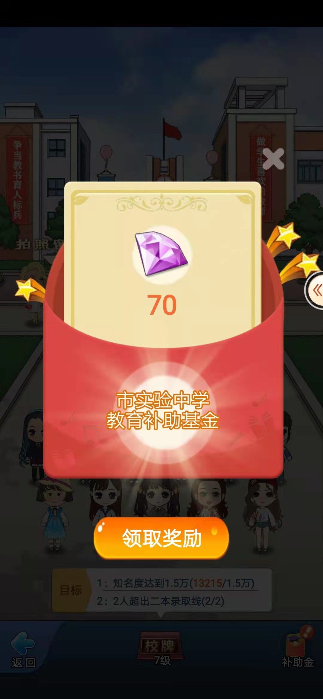点击“校牌”,右下角的“补助金”,随着知名度的上升,可领取的钻石数量也会随之上升,大概是1级+10枚。