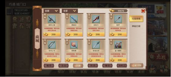 武器分枪,短兵,宝刀,重兵,弓弩,扇子,宝剑,投石车八种品类,总计只有八件基础武器。 每件分为普通,良,优,精4个等级,锻造公式:普*2=良,良*2=优,优*2=精。 公式为:2^n,即2合1。