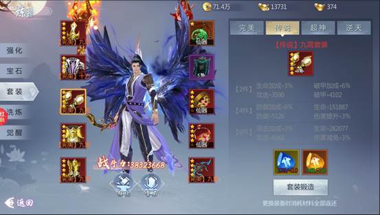 套装分为完美、传说、超神、逆天4个品质,其中铸造完美套装只需要完美材料,传说、超神开始需要传说材料,逆天则还需要额外的逆天材料。