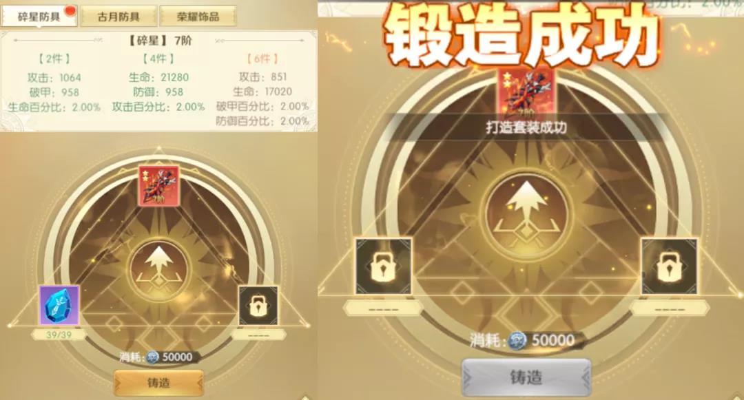 防具套装分为两种,碎星套装与古月套装。狩猎者们需要先消耗碎星石,把装备锻造至碎星套装之后,才可继续锻造升级为古月套装,而锻造升级古月套装不仅需要消耗碎星石,还需要额外使用古月石。当然,古月套装比起碎星套装带来的战力提升与属性加成更高。
