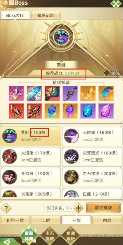 狩猎BOSS分为三种:翡翠林渊、炎石魔城、龙啸祭坛。