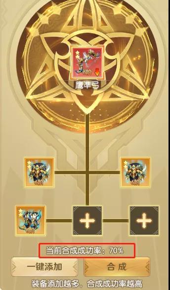 需要注意的是,在合成装备时会显示成功率,若成功率没有达到百分百则会有合成失败的概率,当装备合成失败时,则会损失掉所有装备,但下一次合成装备的成功率会增加15%。